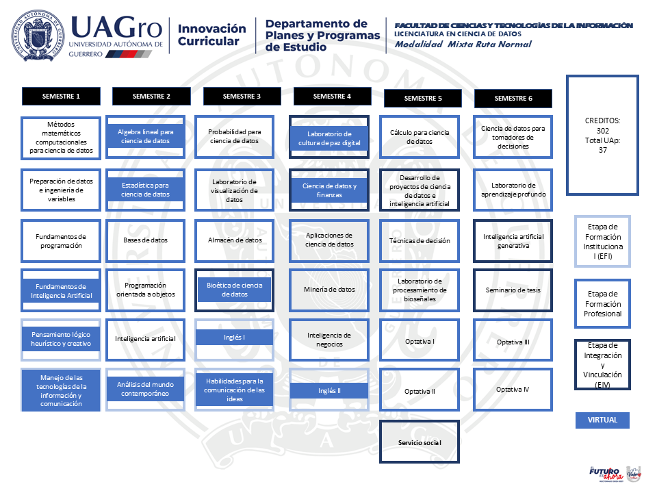 La finalidad del plan de estudio de la LCD es formar profesionales capaces de analizar, modelar y transformar grandes volúmenes de información en conocimiento estratégico para la toma de decisiones en diversos ámbitos: educativo, gubernamental, empresarial, científico y social. El propósito es dotar a los egresados de competencias integradoras en matemáticas aplicadas, programación, estadística, inteligencia artificial e innovación tecnológica, con una visión humanista, ética y socialmente responsable, en concordancia con la Ley General de Educación Superior (LGES, 2021) y los principios de la Nueva Escuela Mexicana (SEP, 2019).